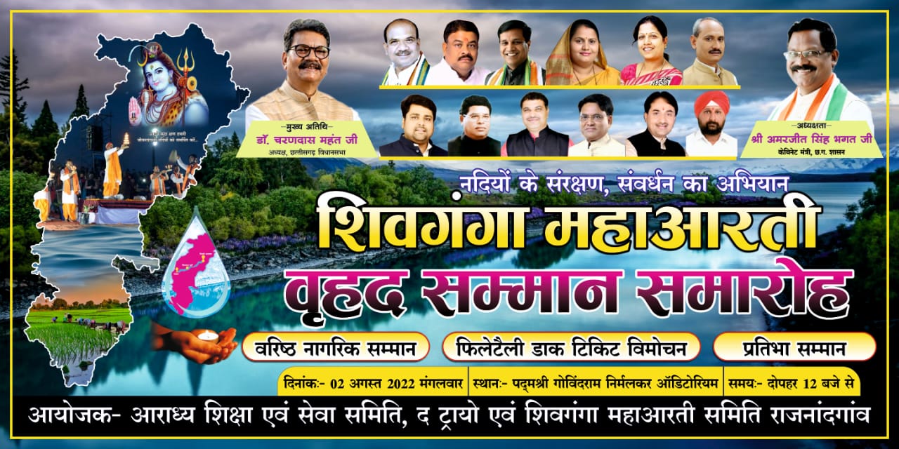 राजनांदगांव। नदियों के संरक्षण संवर्धन के लिए प्रति माह के प्रदोष तिथि पर राजनांदगांव शहर के शिवनाथ नदी के तट पर आयोजित हो रही शिवगंगा महाआरती की 50वीं कड़ी पूर्ण होने के अवसर पर शिवगंगा महाआरती समिति, राष्ट्रीय मासिक पत्रिका “द ट्रायो” और आराध्य शिक्षा एवं सेवा समिति द्वारा वृहद सम्मान समारोह का आयोजन पद्मश्री गोविंदराम निर्मलकर ऑडिटोरियम में 2 अगस्त दोपहर 12:00 बजे से किया जा रहा है। जिसमें 125 से अधिक प्रतिभाओं का सम्मान होगा।